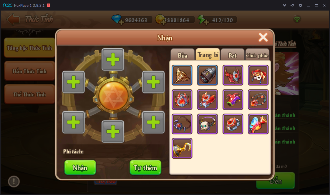 Tính năng Phân Tách - Có thể đem Bùa, Trang Bị, Pet, Chúc Phúc không sử dụng để chuyển hóa thành nguyên liệu thức tỉnh thông qua tính năng Phân Tách